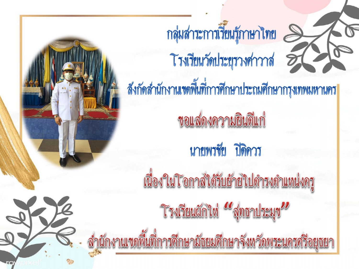 กลุ่มสาระการเรียนรู้ภาษาไทย ขอแสดงความยินดีแก่ นายพรชัย ปิติควร เนื่องในโอกาสได้รับย้ายไปดำรงตำแหน่งครู ที่ โรงเรียนผักไห่ "สุทธาประมุข" สพม.อยุธยา