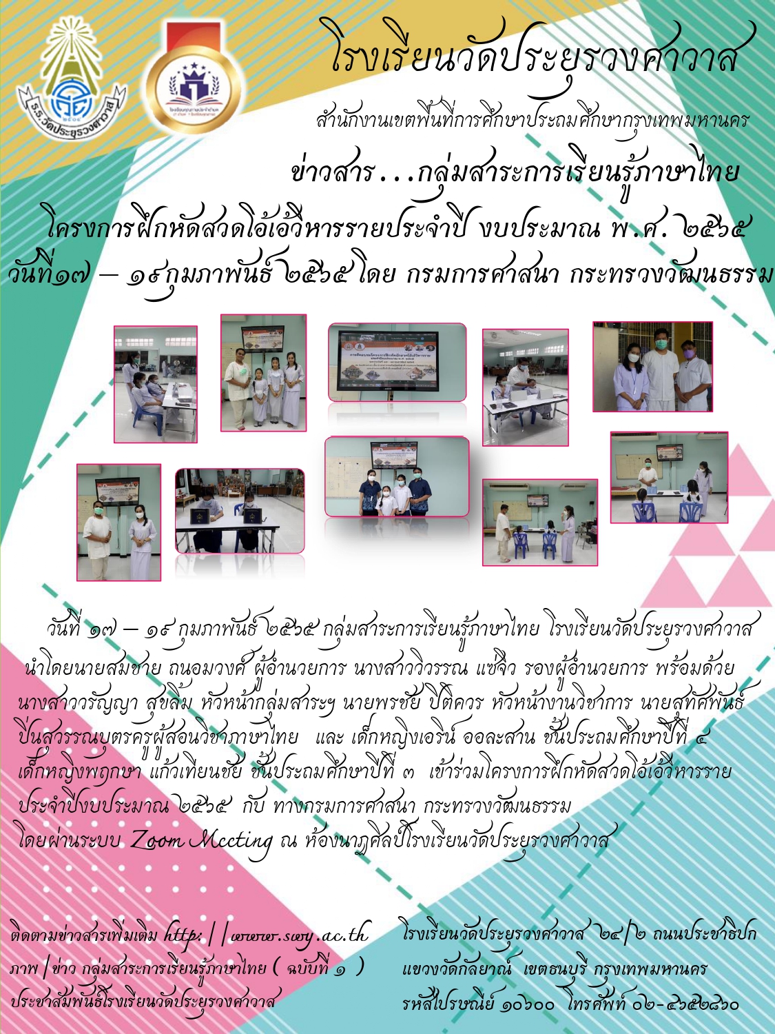 กลุ่มสาระการเรียนรู้ภาษาไทยเข้าร่วมโครงการฝึกหัดสวดโอ้เอ้วิหารรายประจำปีงบประมาณ2562 กับทางกรมการศาสนา กระทรวงวัฒนธรรม ในวันที่ 17 - 19 กุมภาพันธ์ 2565