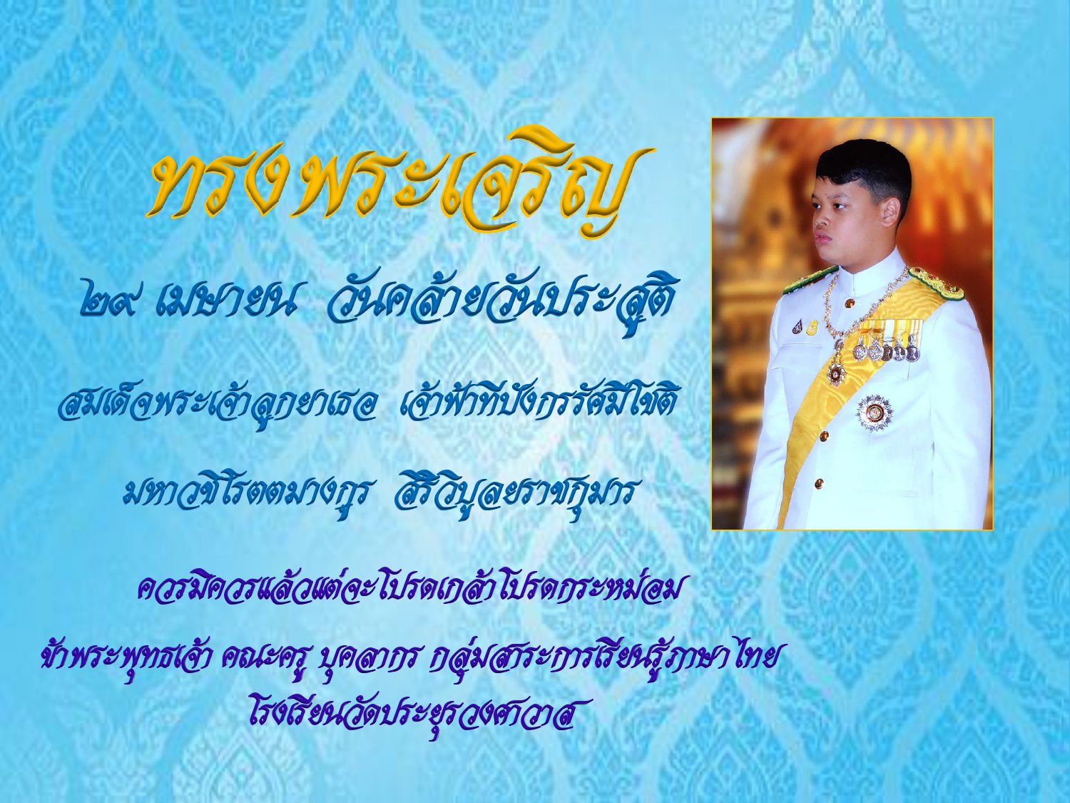 ทรงพระเจริญ ๒๙ เมษายน ควรมิควรแล้วแต่จะโปรดเกล้าโปรดกระหม่อม ข้าพระพุทธเจ้า คณะครู บุคลากร กลุ่มสาระการเรียนรู้ภาษาไทย โรงเรียนวัดประยุรวงศาวาส
