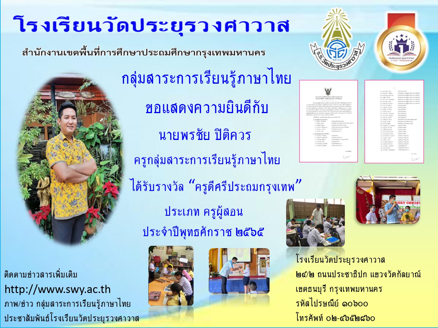 ขอแสดงความยินดีกับครูพรชัย ปิติควร ครูกลุ่มสาระการเรียนรู้ภาษาไทย ได้รับรางวัลครูดีศรีประถมกรุงเทพ ประจำปี ๒๕๖๕