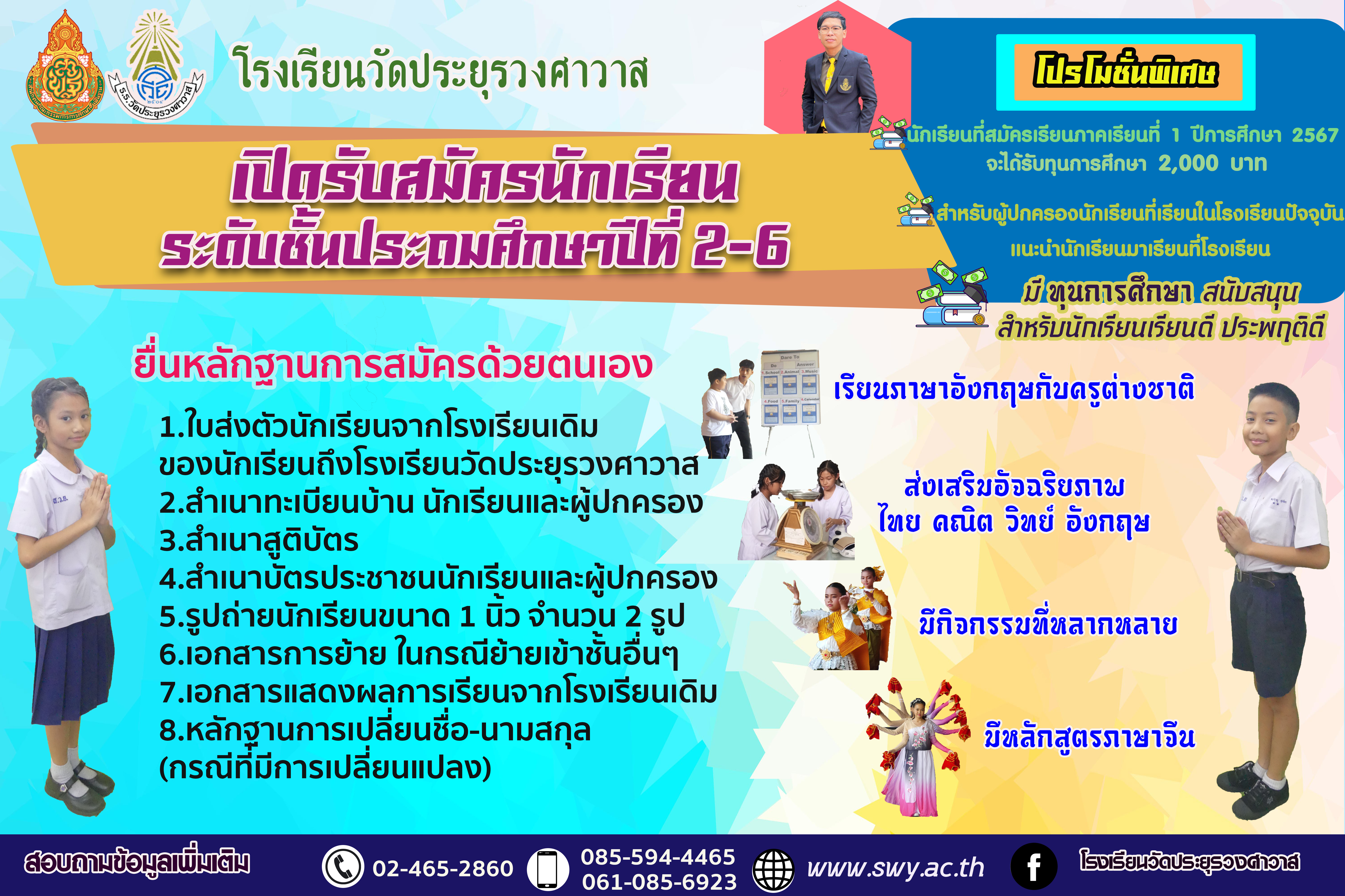 โรงเรียนวัดประยุรวงศาวาสเปิดรับสมัครนักเรียนระดับชั้นประถมศึกษาปีที่ 2-6 ปีการศึกษา 2567