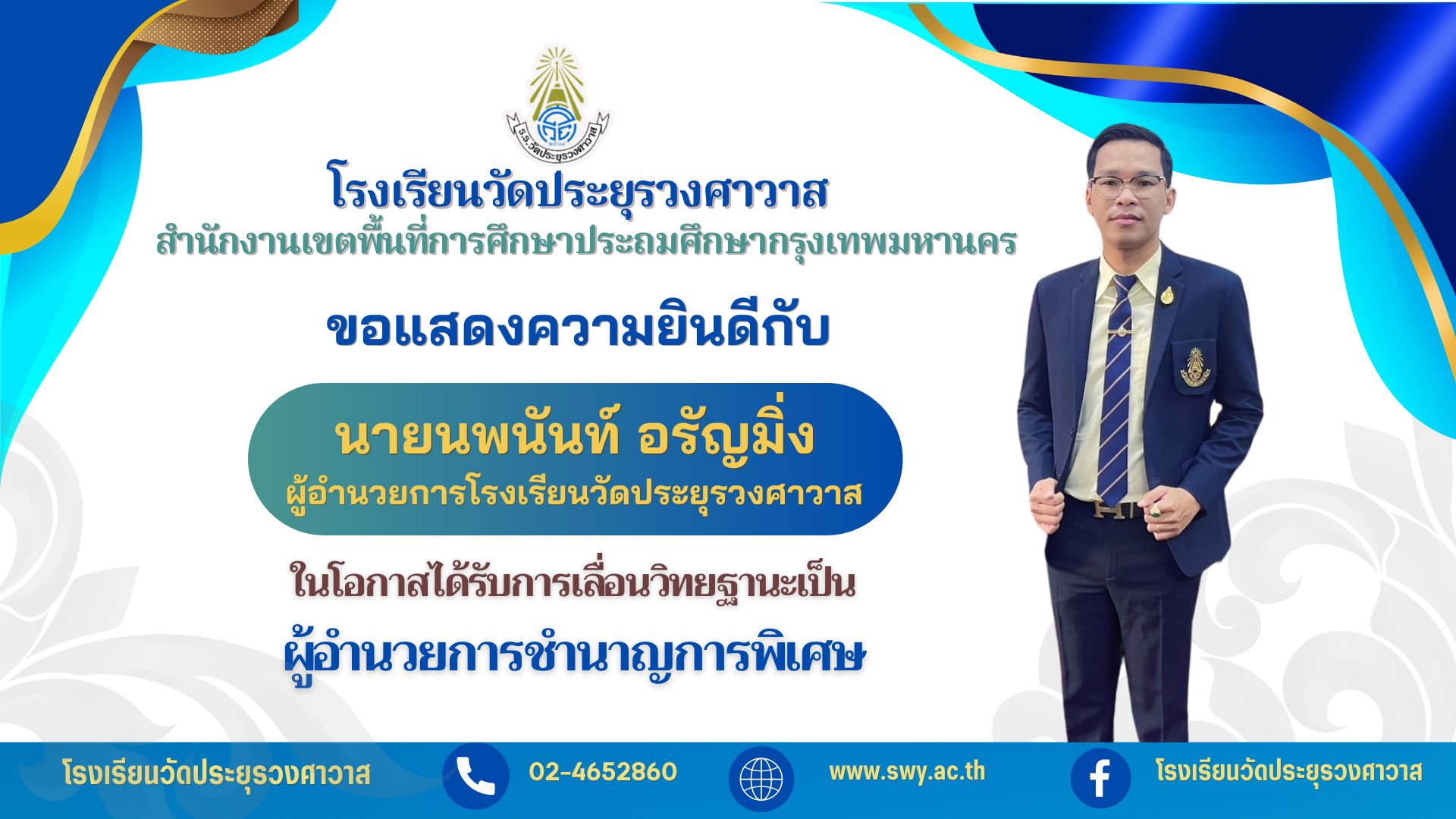 โรงเรียนวัดประยุรวงศาวาสขอแสดงความยินดีกับผู้อำนวยการนพนันท์ อรัญมิ่งในโอกาสได้รับการเลื่อนวิทยฐานะเป็นผู้อำนวยการชำนาญการพิเศษ