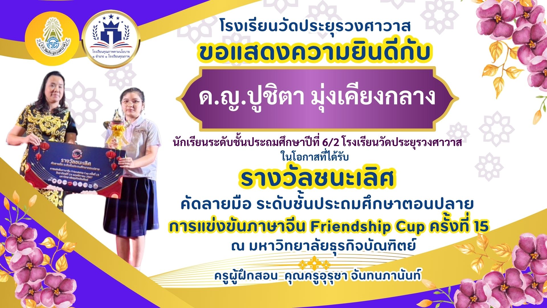 ขอแสดงความยินดีกับด.ญ.ปูชิตา มุ่งเคียงกลางในโอกาสรับรางวัลชนะเลิศคัดลายมือภาษาจีน การแข่งขัน Friendship Cup ครั้งที่ 15