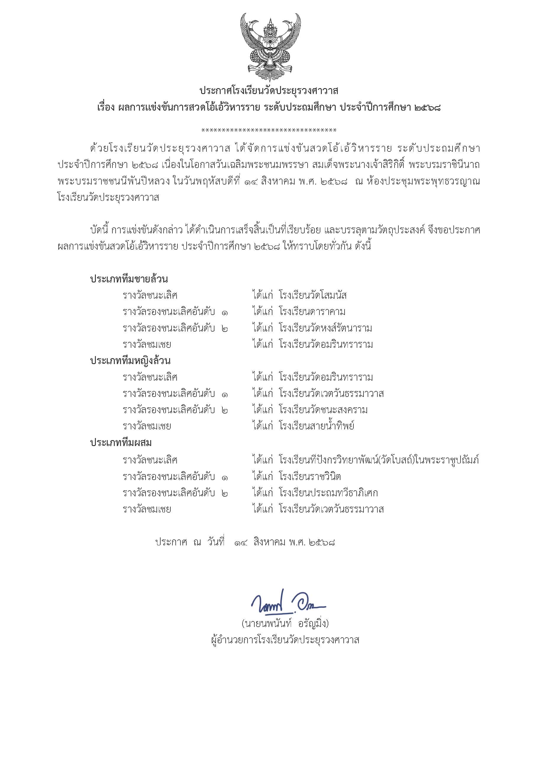 ประกาศโรงเรียนวัดประยุรวงศาวาส เรื่อง ผลการแข่งขันการสวดโอ้เอ้วิหารราย ระดับประถมศึกษา ประจำปีการศึกษา ๒๕๖๘